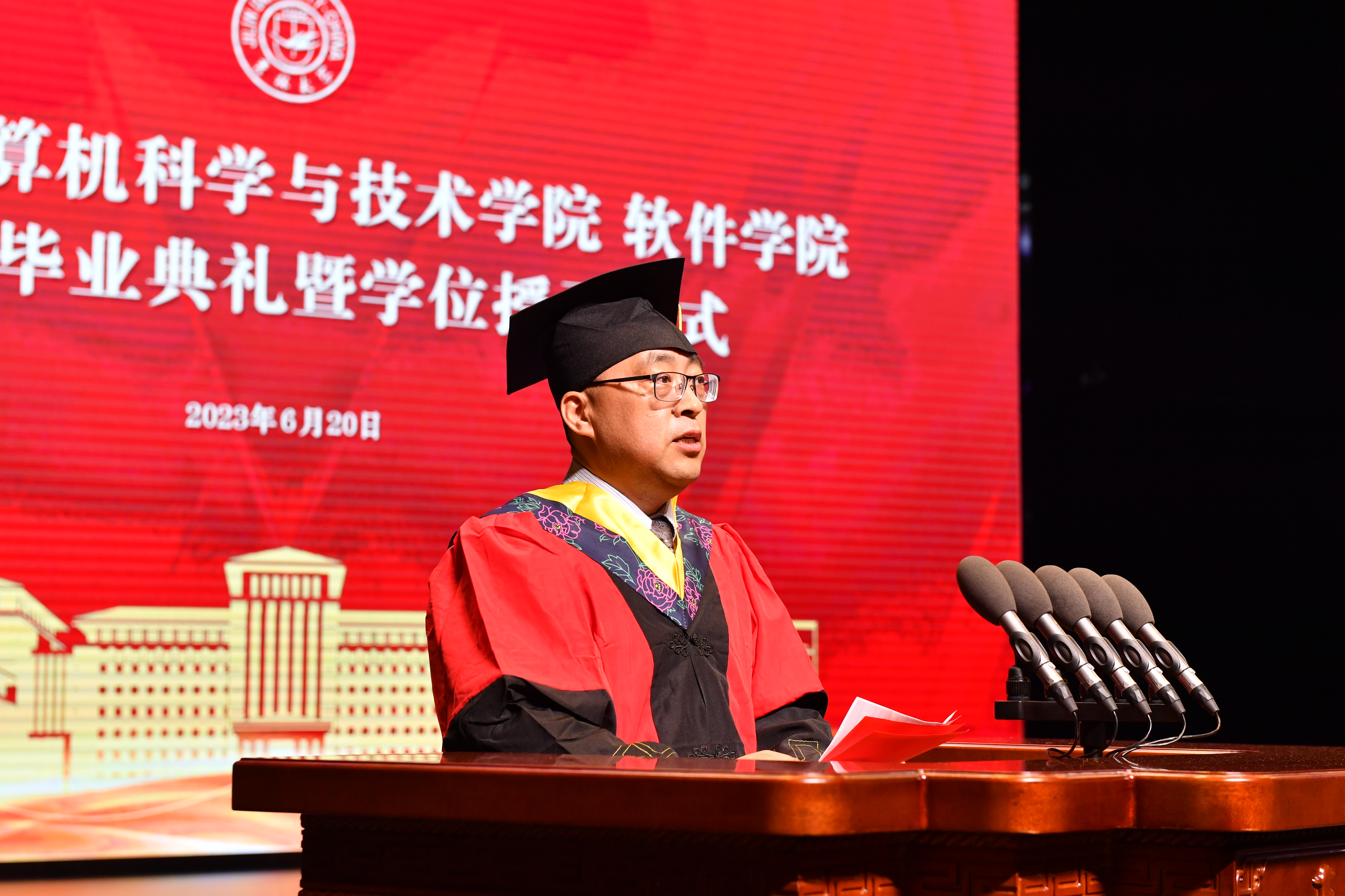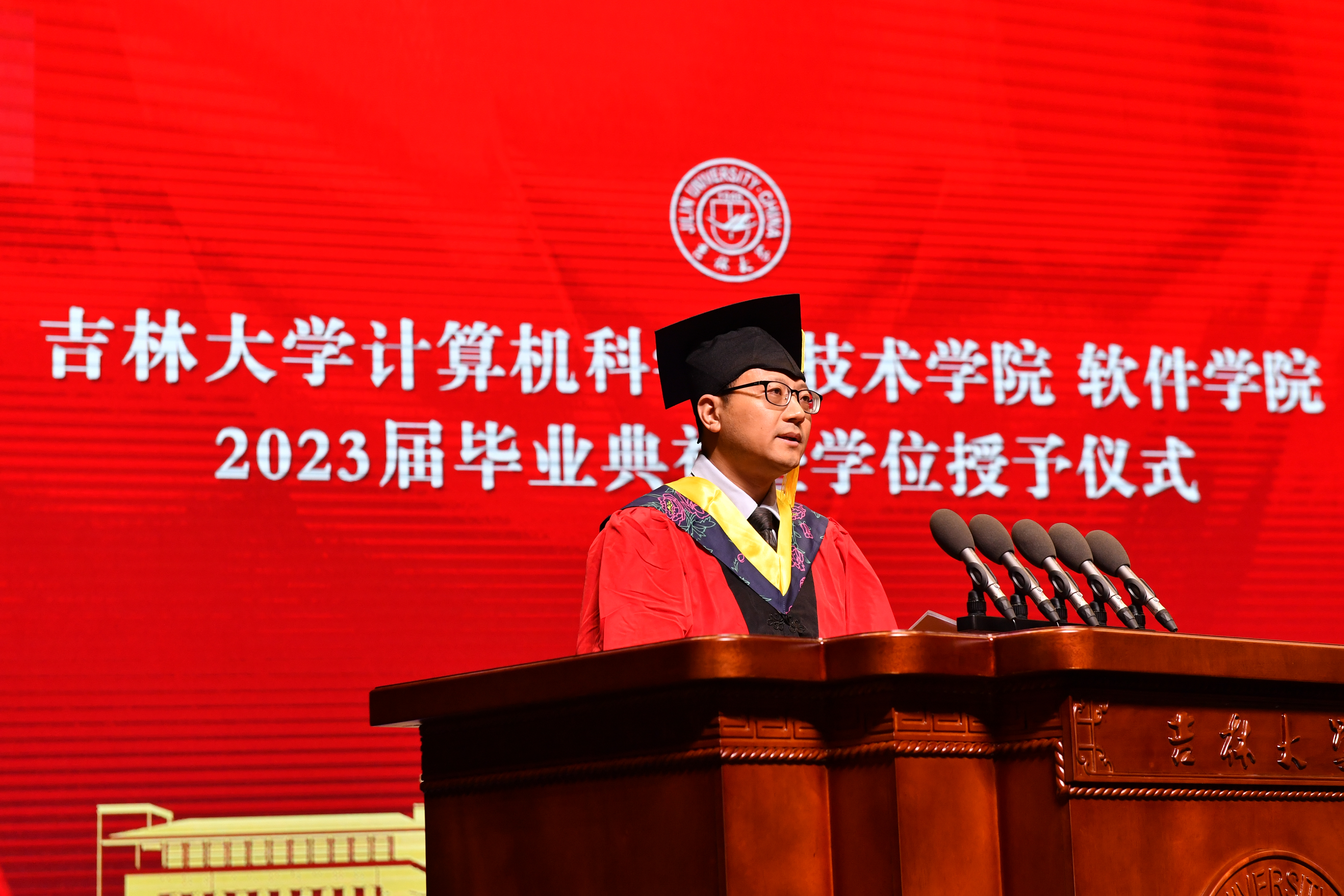 杨博院长做了主题为“信息革命引领新时代,做到两个非同凡想(响)”的致辞,他向即将开启人生新篇章的各位毕业生们表示热烈的祝贺,也向陪伴同学们一路成长的老师和家长们表达了衷心的感谢。杨院长用两个非同凡想(响)寄语毕业生,第一个非同凡想的“想”是思想的“想”,意味着拥有打破常规、进行颠覆性创新的智慧与勇气。第二个非同凡响的“响”是响亮的“响”,意味着拥有舍我其谁,引领世界发展潮流的雄心和抱负。期盼同学们在巨变中的信息时代心怀远志,厚积薄发,敢想敢做,在践行吉大梦、中国梦的道路上勇立时代潮头,再谱青春华章。