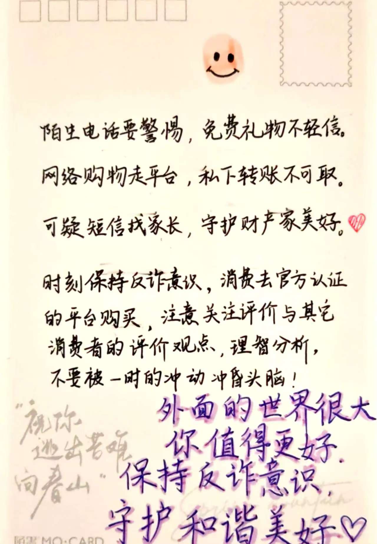 在中心体育馆广场设立活动线下宣传摊位。志愿者们热情地向过往同学们讲解常见诈骗手法及防范要点,普及反诈安全知识,并邀请大家通过绘制反诈主题明信片参与公益行动。